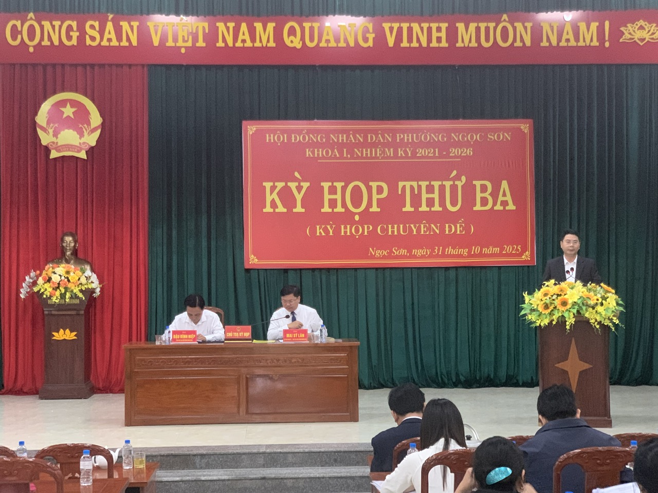 Sáng ngày 31/10/2025 dưới sự chủ trì của đồng chí Mai sỹ Lân, bí thư Đảng Uỷ - chủ tịch Hội đồng Nhân dân phường Ngọc Sơn, kỳ họp thứ ba Hội đồng Nhân dân phường khoá I nhiệm kỳ 2021-2026 đã chính thức được khai mạc tại hội trường Đảng uỷ phường Ngọc Sơn.